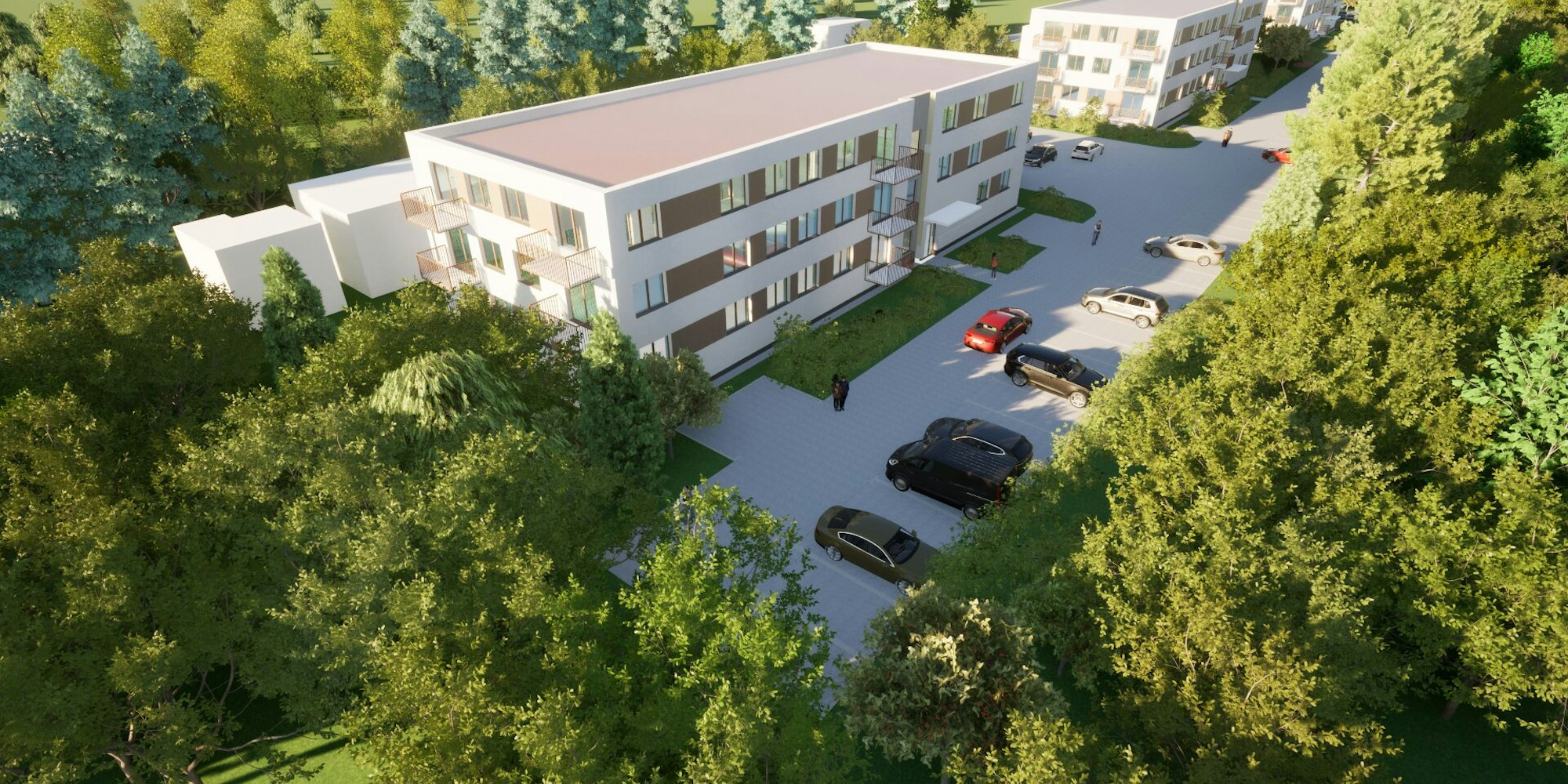 Projekt osiedla wielorodzinnego z elementami drewna na elewacji