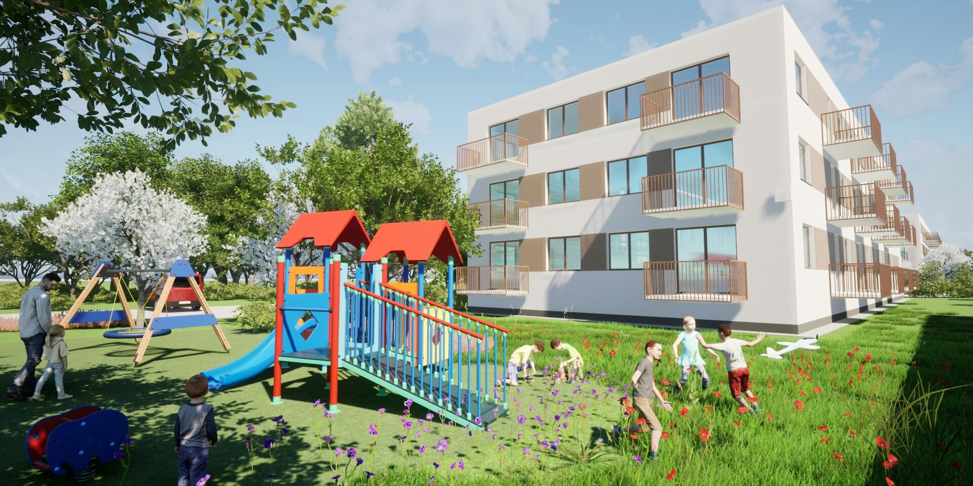 Projekt osiedla wielorodzinnego uwzględnia potrzeby zarówno dzieci, jak i dorosłych, zapewniając odpowiednie przestrzenie zarówno dla zabawy, jak i odpoczynku. Jest to doskonały sposób na stworzenie przyjaznego i harmonijnego środowiska dla mieszkańców, integrując różne grupy wiekowe i umożliwiając im korzystanie z różnorodnych aktywności w bliskim otoczeniu.