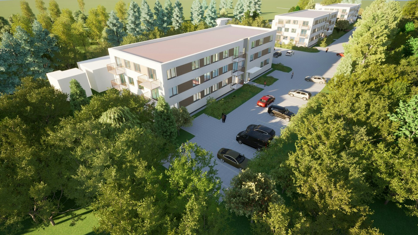 Projekt osiedla wielorodzinnego z elementami drewna na elewacji