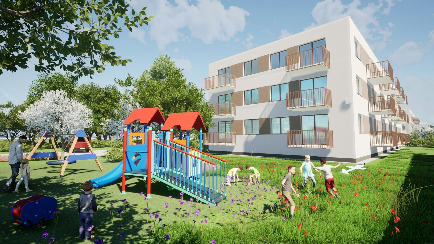 Projekt osiedla wielorodzinnego uwzględnia potrzeby zarówno dzieci, jak i dorosłych, zapewniając odpowiednie przestrzenie zarówno dla zabawy, jak i odpoczynku. Jest to doskonały sposób na stworzenie przyjaznego i harmonijnego środowiska dla mieszkańców, integrując różne grupy wiekowe i umożliwiając im korzystanie z różnorodnych aktywności w bliskim otoczeniu.